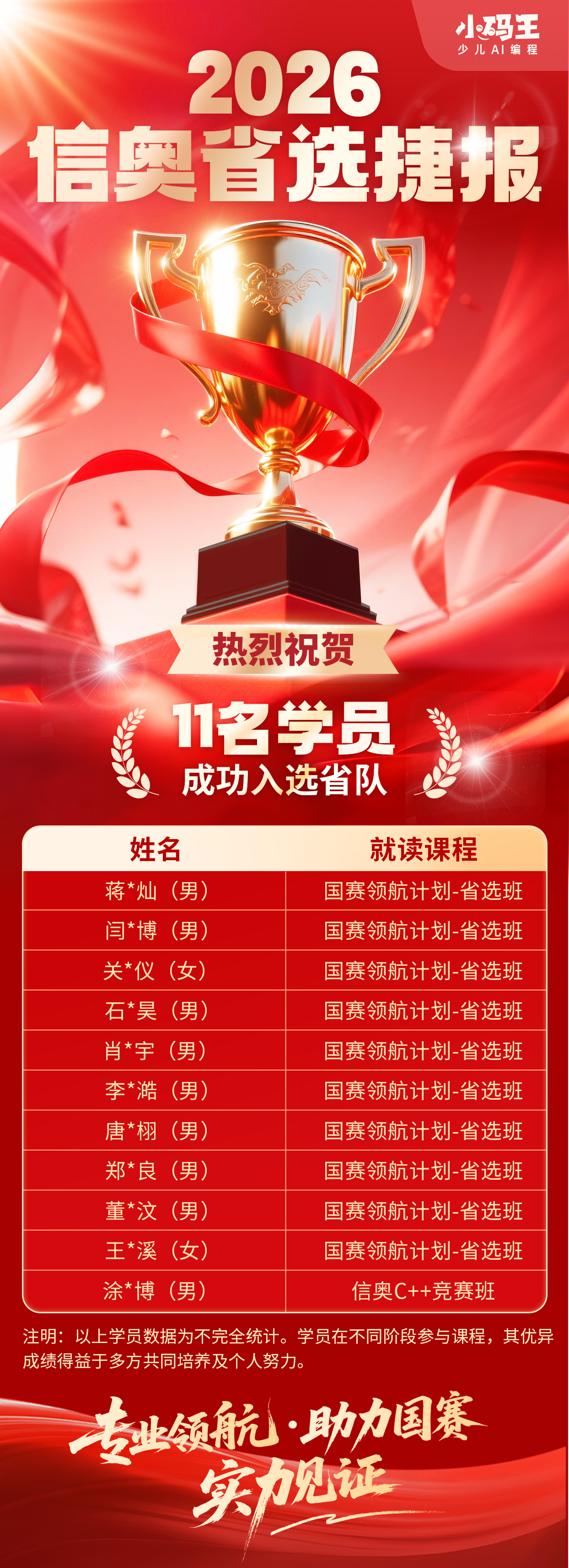 近日,随着2026年NOI各省省选相继落幕,截止当前,全国各省省选名单已经陆续正式发布,小码王再传捷报——11名学员凭借硬核实力成功入选省队,出征2026年全国青少年信息学奥林匹克竞赛(NOI)国赛,向金牌发起冲击!